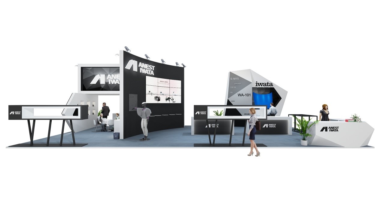 ANEST IWATA展臺位于W1E20展館,展區位于醒目部位,占地面積90平方米.