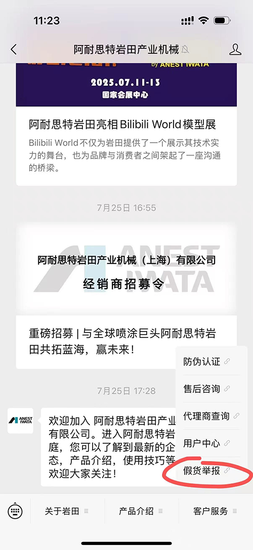為了更好地維護(hù)您的合法權(quán)益,守護(hù)ANEST IWATA品牌的正品品質(zhì),我司微信公眾號(hào)菜單欄現(xiàn)已新增 “假貨舉報(bào)” 功能!