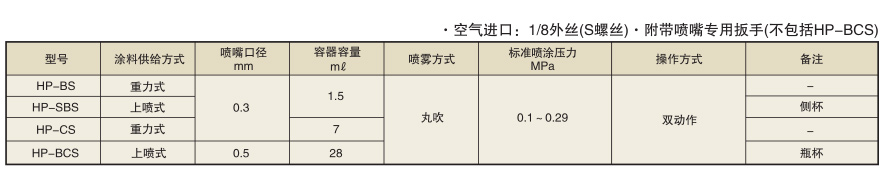 ·更換噴嘴,針,噴嘴槍帽等零部件,就可以改變涂料噴嘴口徑。(φ0.3mm⇔φ0.5mm)