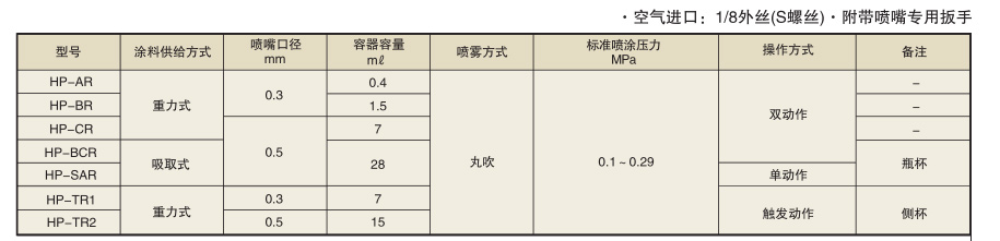 ·備有雙動作,單動作2種類型。 ·采用了耐溶劑性優異的針墊片。 ·標準配備便于分解沖洗的按鈕針夾頭。(僅限雙動作) ·由于扳機型是側瓶式,瓶子可以裝在左右任何一側,所以也推薦習慣用左手的人使用。