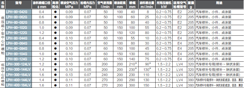 分涂料等也可以噴涂成均勻涂面。 環保型噴槍 LPH-300/400型是高噴涂效率,低飛濺的環保型低空氣量,