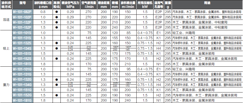 噴槍操作性提高 改變了抓握形狀,手感更好了。 減輕主體重量(與W-100相比,減輕約▲10%),進(jìn)一步改變了重量平衡的位置。 霧化性能提高 使空氣的流動(dòng)穩(wěn)定后,圖樣形狀穩(wěn)定,減少了噴涂不均勻,改變空氣槍帽角部形狀,涂料附著現(xiàn)象也隨之減輕了。